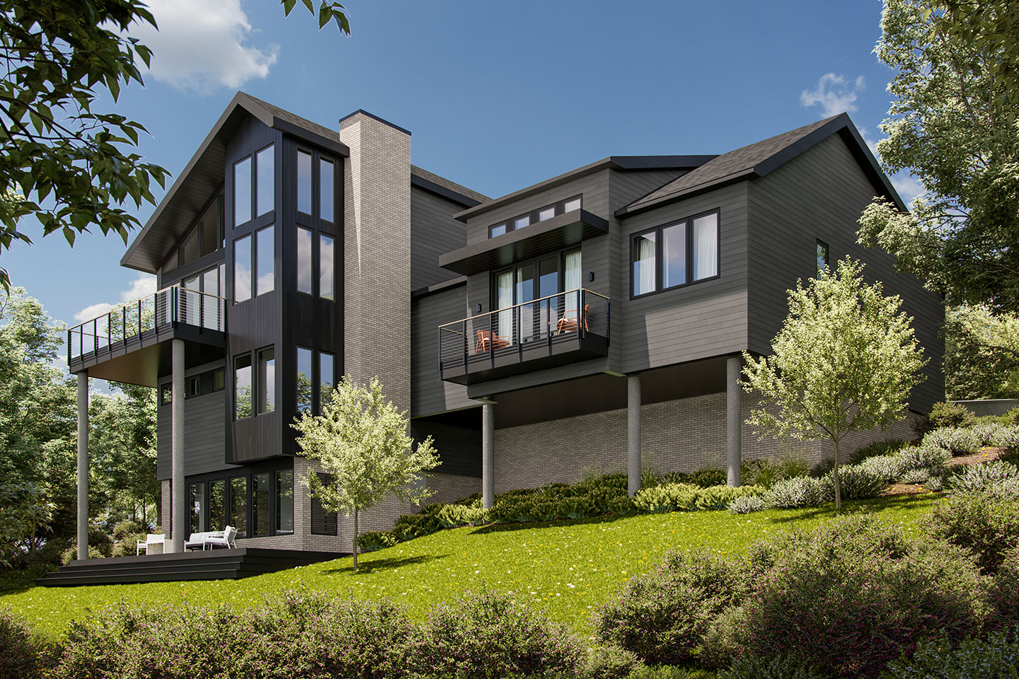 Set into the hillside with care, this single-family home features a clean, modern profile and a welcoming, elevated entry. Large front-facing windows bring in ample natural light and offer glimpses of the surrounding forest, while the home’s compact form and gentle integration into the slope reflect The Summit’s conservation-first approach.
